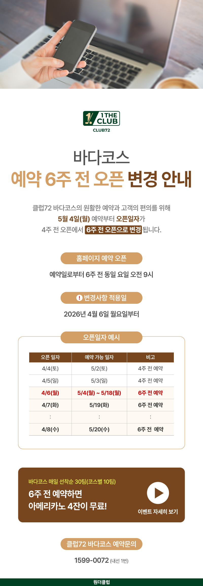 제목[클럽72] 바다코스 예약 오픈일자 변경안내 (4주전→6주전 오픈) 2026-04-03 03:04:47